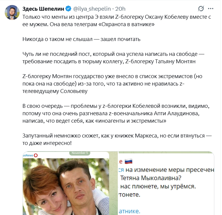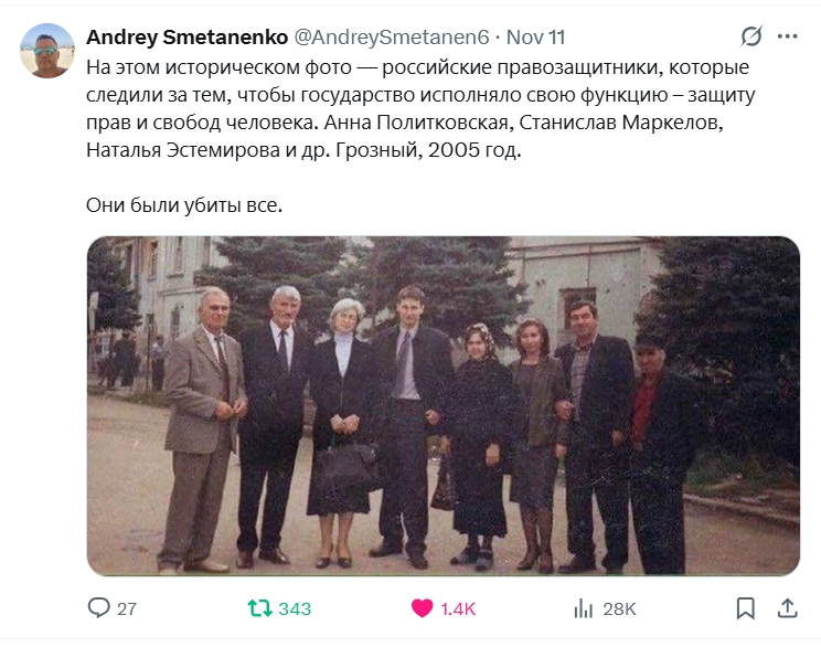 Ik pa brīdim te pavīd stāsti par brīvību Krievijā un tamlīdzīgi. "Šajā vēsturiskajā foto - Krievijas tiesību aizstāvji, kas sekoja tam, lai valsts izpildītu savu funkciju - cilvēka tiesību un brīvību aizsardzību. Anna Poļitkovskaja, Staņislavs Markelovs, Natālija Estemirova un citi. Groznija, 2005. gads.