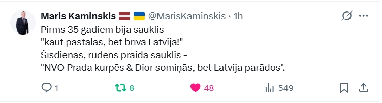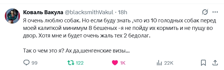Bija te raudāšana no Krievijas puses, ka tur esot kaut kādas problēmas izbraukt uz Eiropu. Teksts šāds: "Es ļoti mīlu suņus. Bet, ja es zināšu, ka no desmit suņiem badā pie manas sētas ir vismaz astoņi slimi ar trakumsērgu - es neiešu viņus barot un nelaidīšu sētā. Lai arī man būs žēl to divu nelaimīgo. Tā, par ko es te? Ak jā, Šengenas vīzas..."