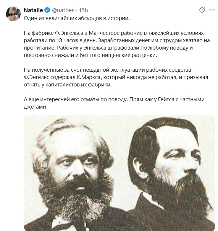 Par līdzekļiem, kurus ieguva nežēlīgi ekspluatējot strādniekus, Fridrihs Engelss uzturēja Kārli Marksu, kurš nekad netika strādājis un aicināja atņemt kapitālistiem viņu fabrikas.
