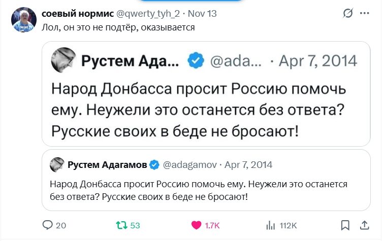 Internets visu saglabā. Arī 2014. gada 7. aprīļa Rustema Adagamova aicinājumu Krievijai palīdzēt Donbasa krieviem. Sava laika Putina vēlēšanu kampaņas organizatoru mūsdienās mēģina pasniegt kā cīnītāju pret Krievijas iebrukumu Ukrainā.