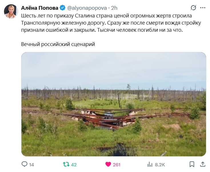 Vēl nedaudz par sociālismu: "Sešus gadus pēc Staļina pavēles valsts ar milzīgu upuru skaitu būvēja Transpolāro dzelzceļa staciju. Tūlīt pēc vadoņa nāves būvi atzina par kļūdu un slēdza. Tūkstoši cilvēki nomira ne par ko.