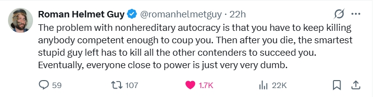Par to, kā diktatūra padara sabiedrību stulbu: "Problēma autokrātijās ir tas, ka tev ir jāturpina nogalināt visi, kas ir kompetentāki par tevi, lai viņi tevi negāztu. Pēc tam, kad tu nomirsti, gudrākajam no idiotiem, kas palikuši, ir jāsāk nogalināt visi pārējie pretendenti, šādi tev sekojot. Rezultātā visi tuvākie pie varas ir aizvien stulbāki un stulbāki."