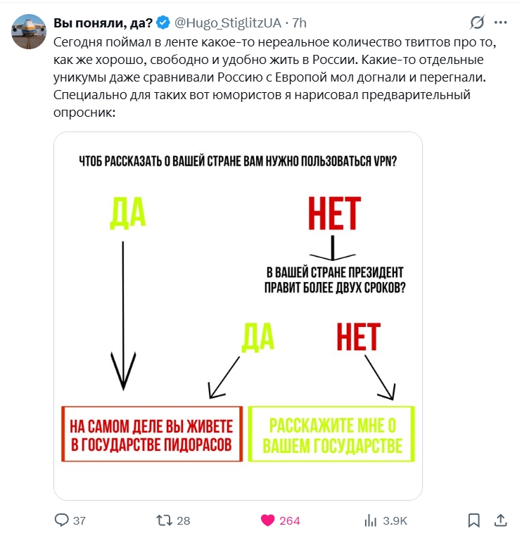 Vēlreiz par to, kā Krievijas boti izmisīgi stāsta par to, cik brīvi un ērti ir dzīvot Krievijā. Vienkārši divi faktori - ja tev ir jālieto VPN, lai stāstītu patiesību par tavu valsti un tavā valstī prezidents valda ilgāk par diviem termiņiem - tad patiesībā tu dzīvo sliktā valstī.