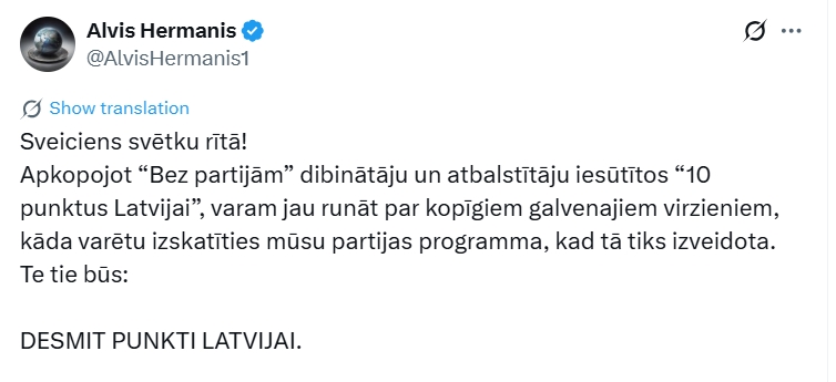 Alvis Hermanis @AlvisHermanis1: "Sveiciens svētku rītā! Apkopojot "Bez partijām" dibinātāju un atbalstītāju iesūtītos "10 punktus Latvijai", varam jau runāt par kopīgiem galvenajiem virzieniem, kāda varētu izskatīties mūsu partijas programma, kad tā tiks izveidota. Te tie būs: